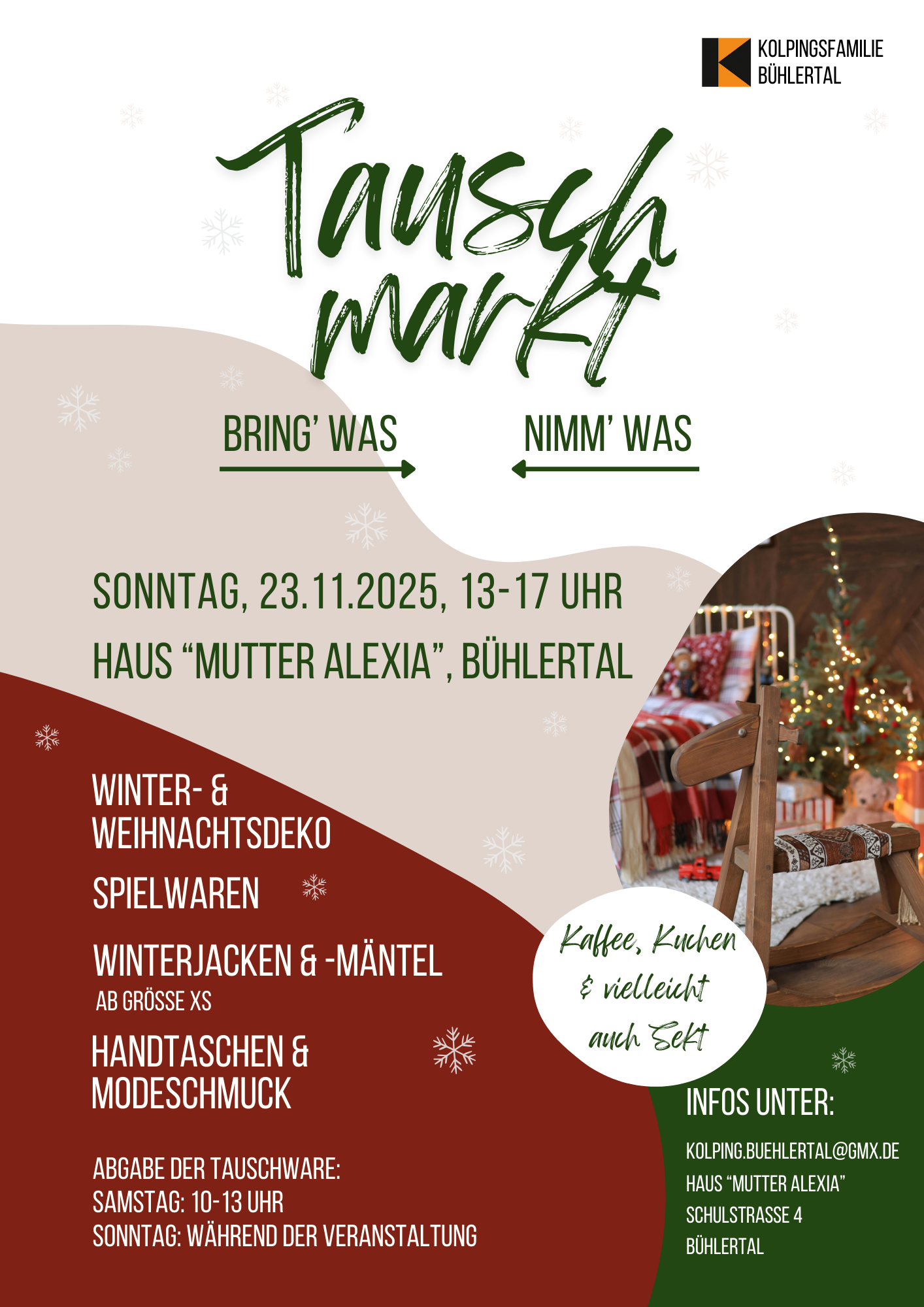 herzlich laden wir euch zu unserem 2. Tauschmarkt am Sonntag, 23.11.2025 von 13 bis 17 Uhr ins „Haus Mutter Alexia“ ein.